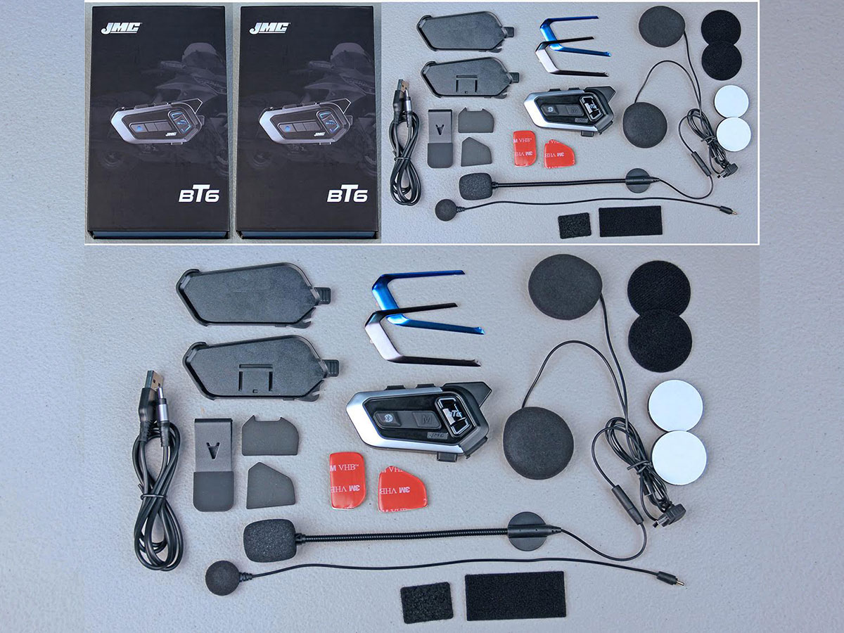 This DUAL helmet headset kit includes 2-BT6 control heads, USB charger/adapter cables, both boom & chin-bar style microphones, two slim-line high-output mount in helmet speakers, mounting clips, control head bases, mounting hardware, Velcro/adhesive pads and complete installation/operation instructions.
