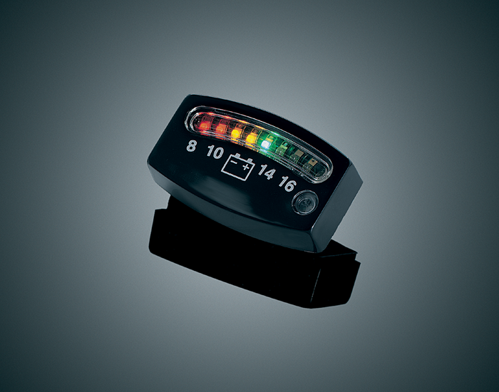 | I have one of these LED battery gauges on my last three bikes and have never had one fail. On my 2008 Goldwing, I mounted the black version just below the left corner of the right front speaker - basically, opposite of where the lever for the foot warmers is located on the left side. In that position, I can see the gauge by glancing forward and down when riding. A small hole was drilled for the power wire, which I ran across to the wiring for the 12 volt connector in the left fairing pocket. Easy modification to do. |